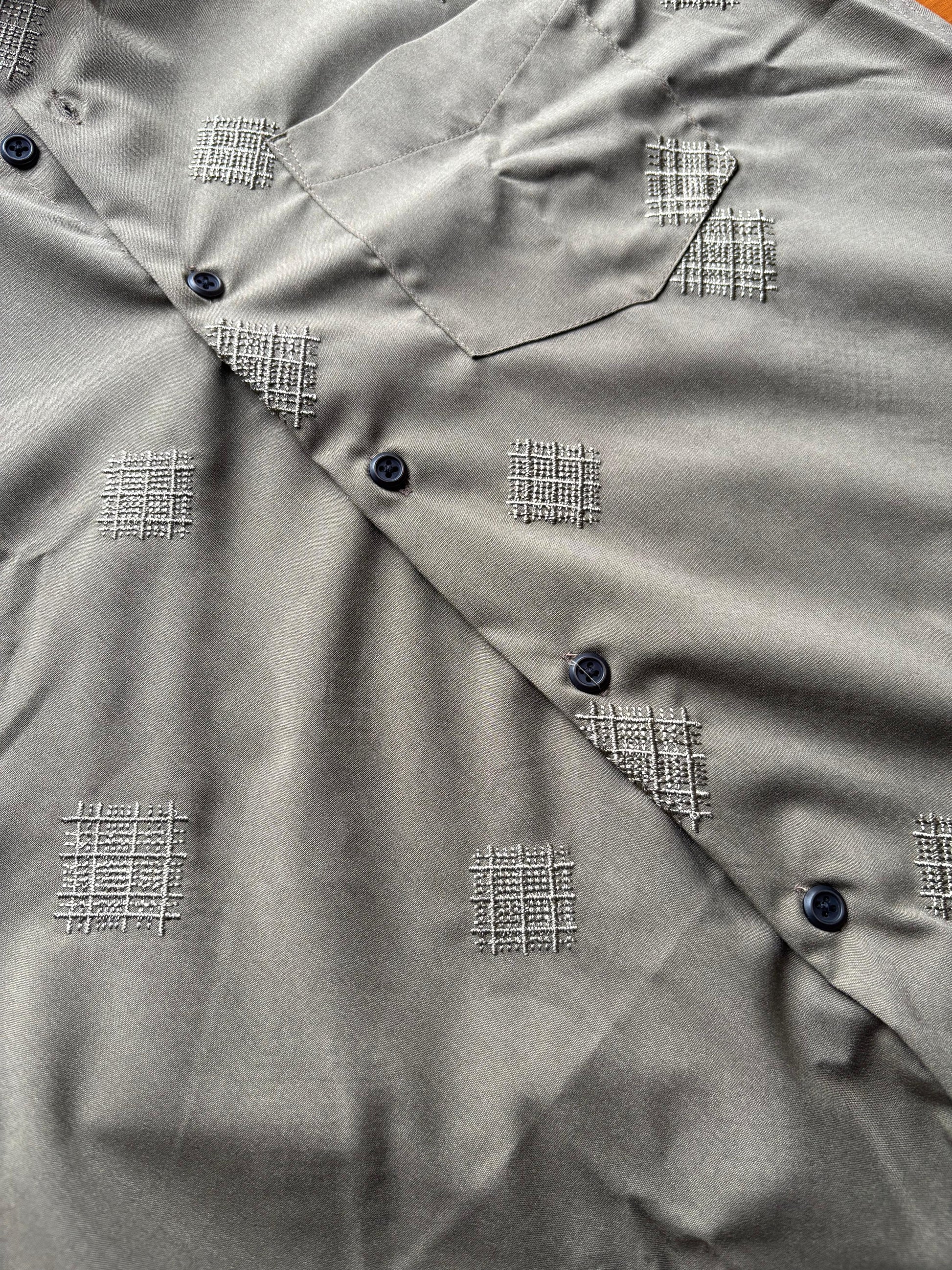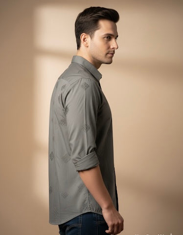 This men's long-sleeve formal shirt in slate gray features sophisticated all-over embroidery in a geometric square pattern woven with dark thread. The textured design adds depth and refinement, transforming a classic collared shirt into a striking statement piece. It has a traditional point collar and a full button-down front with matching dark buttons, delivering a polished, streamlined look without chest pockets for clean minimalism. Ideal for elevating formal attire with subtle yet distinctive detailing.