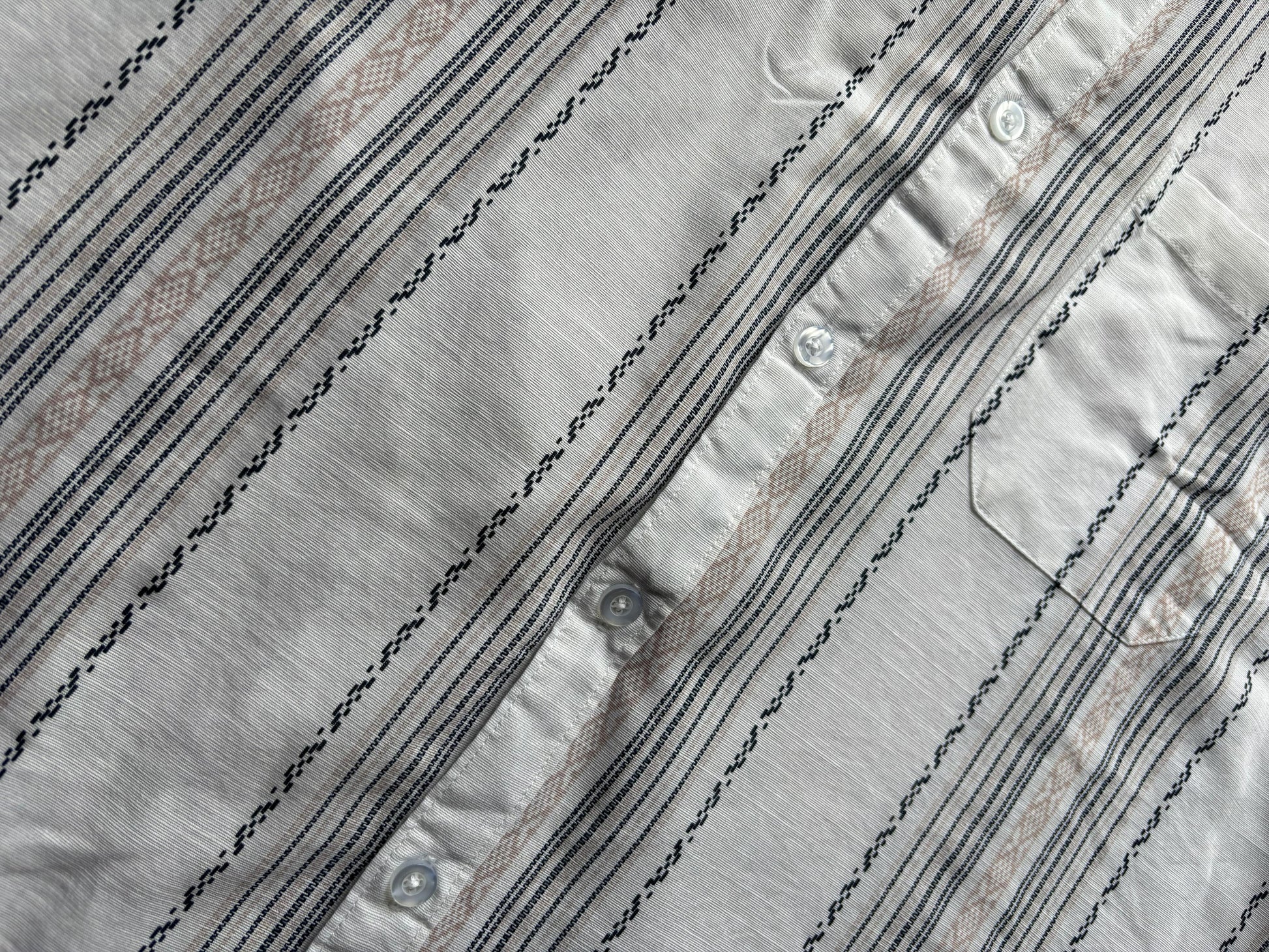 Crafted for laid-back sophistication, this Linen Orange Stripes Shirt features vertical stripes in soft, earthy hues of light gray, beige, and subtle blue on a crisp white background. The varying stripe widths and textures create a vintage-inspired pattern with depth. A single patch pocket and clean white buttoned cuffs add refined details. The relaxed fit offers comfort without sacrificing style, making it ideal for casual to smart-casual occasions. Pair with light-wash denim for effortless, versatile dressing throughout the seasons.